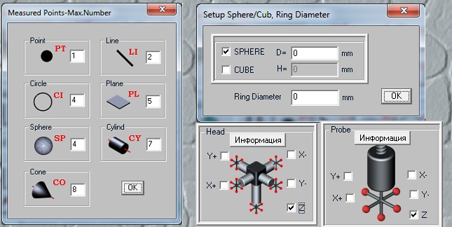 "Setup". Диаметрите на сферите на измервателните сонди се въвеждат